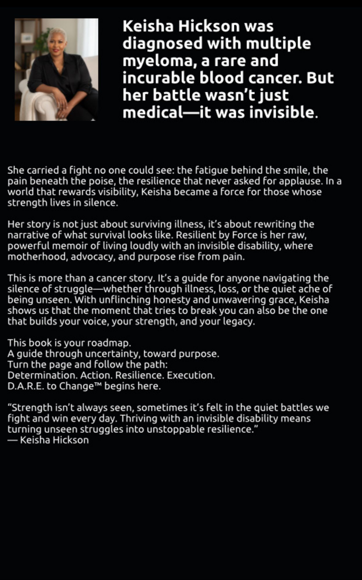 It’s official — Resilient by Force: A Memoir of Relentless Power, Unseen Strength, and Life Beyond Multiple Myeloma" by Keisha Hickson is here. This groundbreaking memoir invites readers into Keisha’s world as she faces the invisible battles of a rare and incurable illness, revealing a story of survival, transformation, and the pursuit of hope. Readers are calling it “raw, riveting, and radically honest”—not only a testament to Keisha’s journey, but also a beacon for anyone navigating adversity or fighting battles that remain unseen.​ |